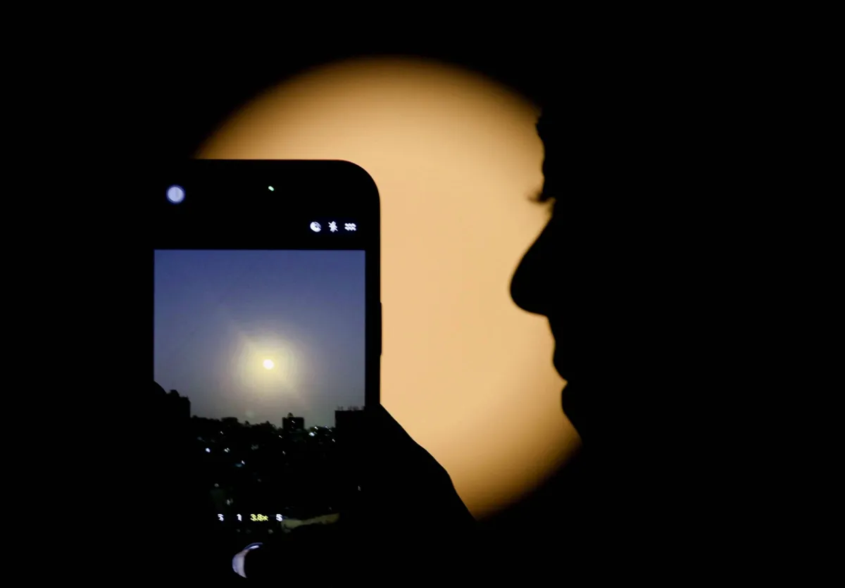امرأة تستخدم هاتفها الذكي لتصوير قمر الذئب أول قمر عملاق في عام 2026 وهو يضيء سماء القاهرة ليلاً (رويترز)