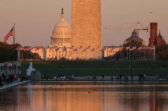 مبنى الكابيتول الأميركي ونصب واشنطن عند الغروب في واشنطن (رويترز)
