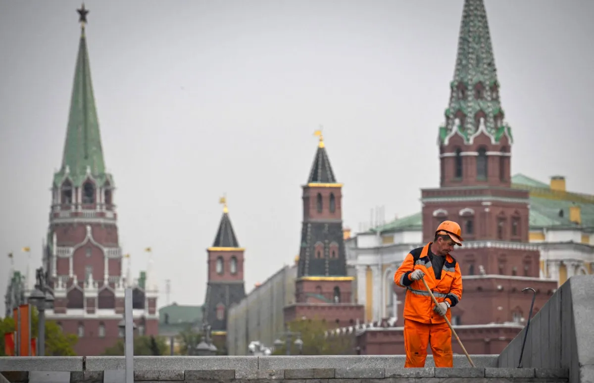 عامل نظافة في أحد الشوارع أمام الكرملين بالعاصمة الروسية موسكو (أ.ف.ب)