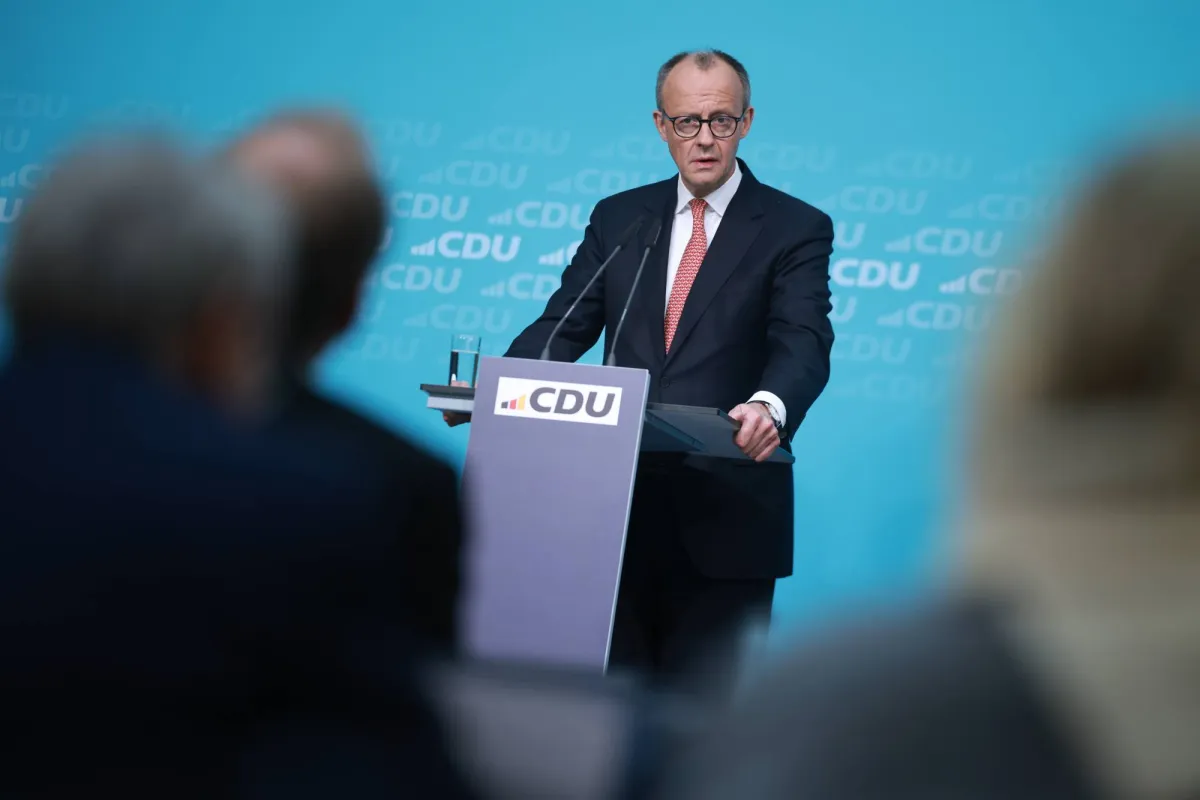 فريدريش ميرتس يتحدث خلال مؤتمر صحافي عقب اجتماع اللجنة التنفيذية لحزب الاتحاد الديمقراطي المسيحي في برلين يوم الاثنين (إ.ب.أ)