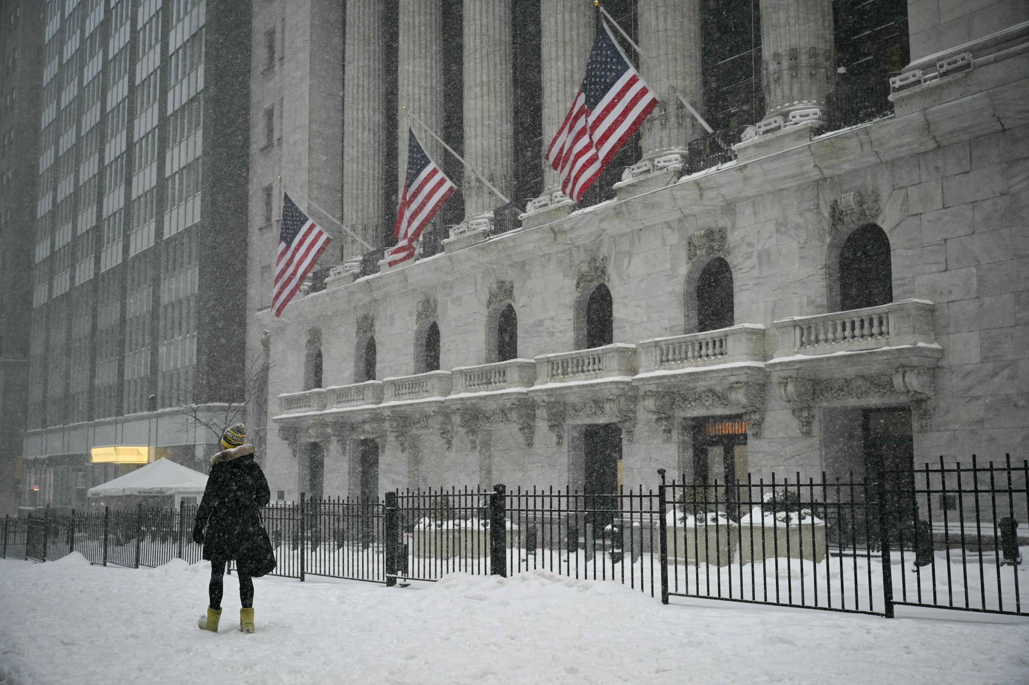 امرأة تسير أمام بورصة نيويورك في الحي المالي بينما تتساقط الثلوج (أ.ف.ب)