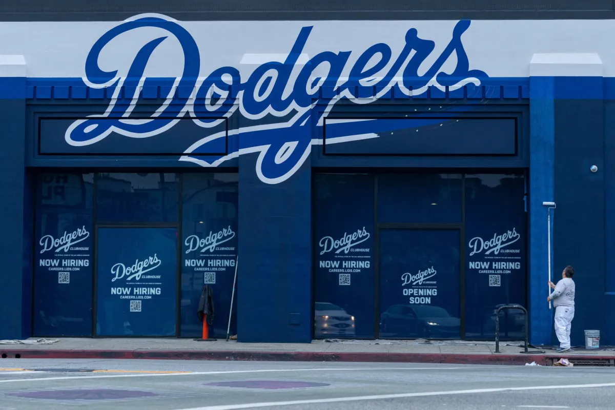 عامل يدهن الجدران الخارجية لمبنى يعرض وظائف لدى فريق «لوس أنجليس دودجرز» وسط مدينة لوس أنجليس (رويترز)
