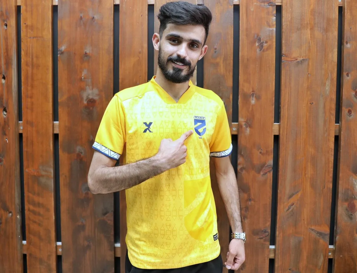 المزيريب مرتدياً قميص الحزم بعد توقيع العقد (نادي الحزم)
