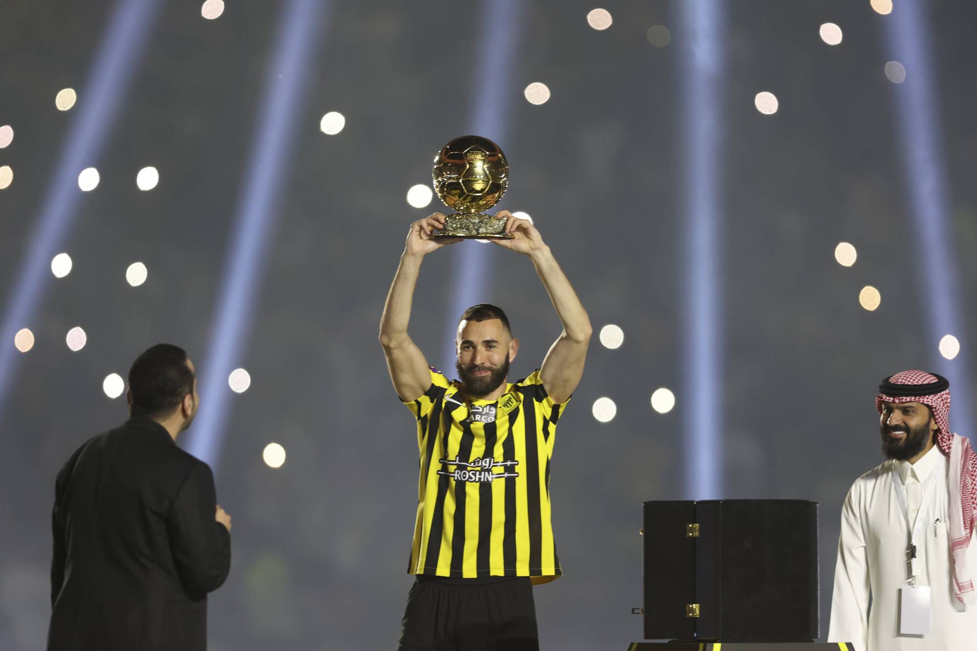 كريم بنزيمة خلال تدشين حفل الدوري السعودي الاثنين (أ.ب)
