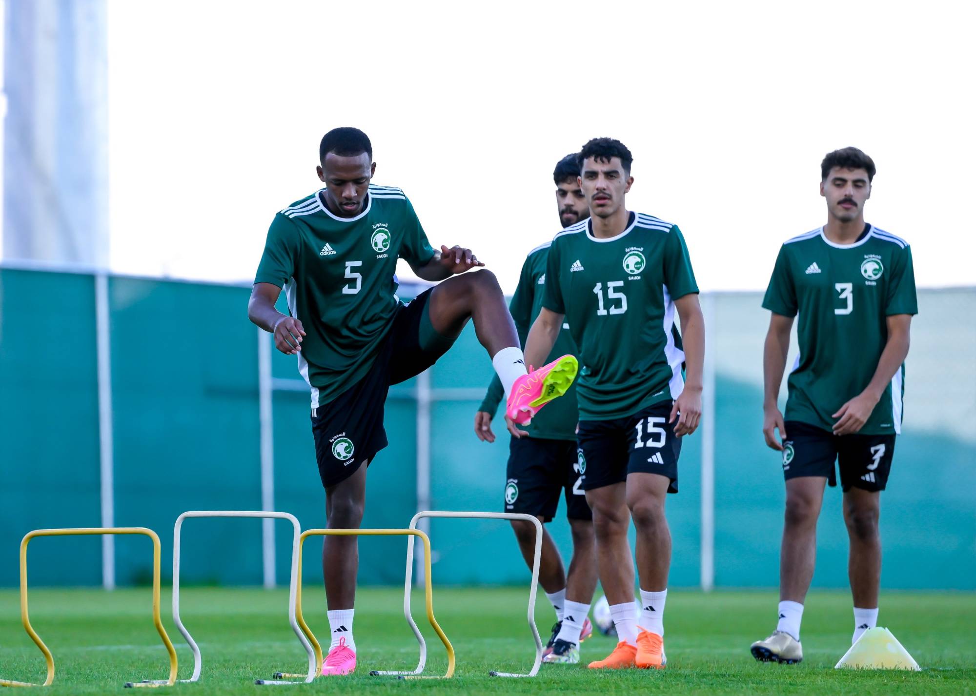 لاعبو الأخضر الأولمبي خلال الحصة التدريبية الأخيرة تأهباً لمواجهة منغوليا (المنتخب السعودي)
