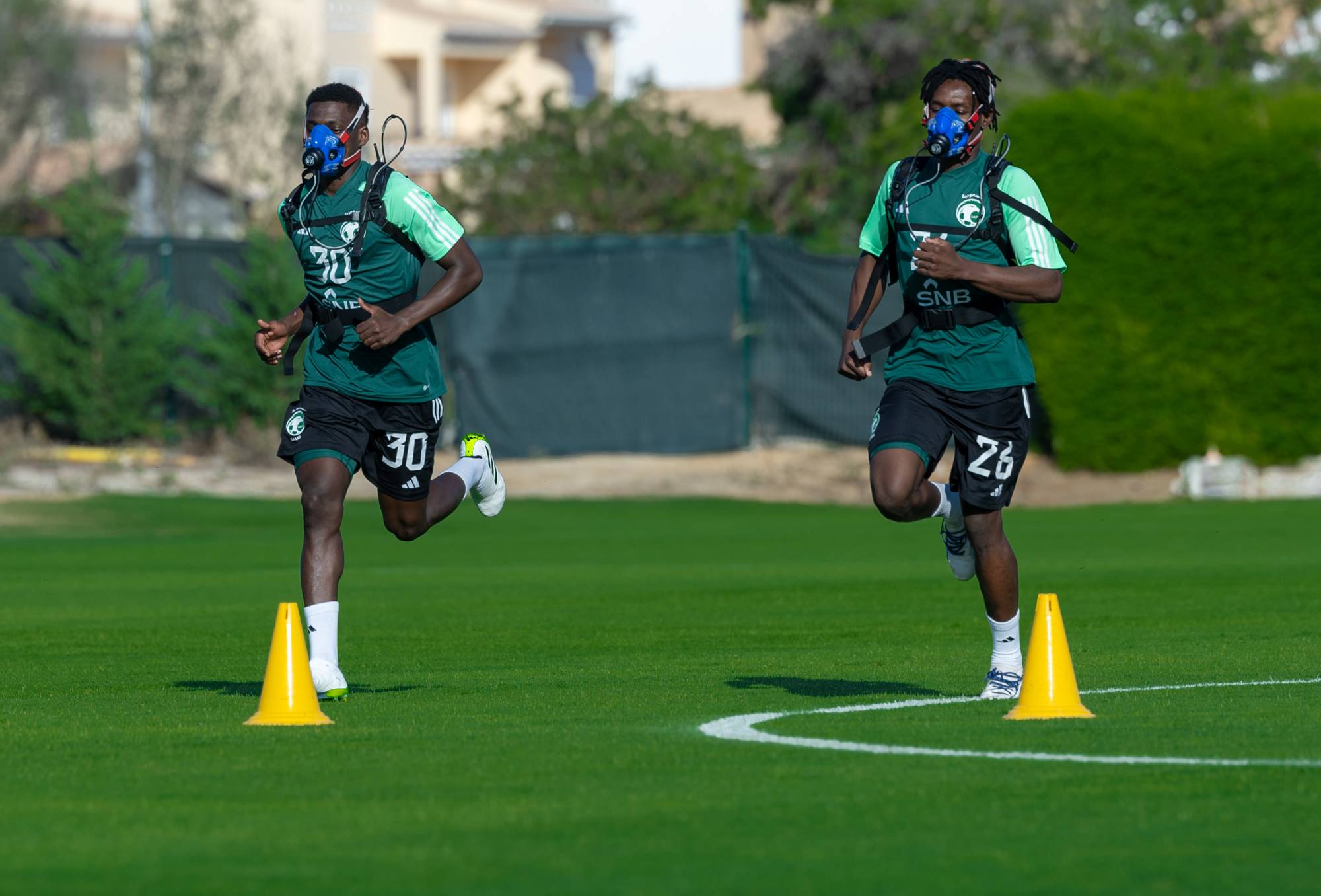وأظهرت اللقطات لاعبي «الأخضر» يرتدون كمامات طبية لقياس معدل اللياقة والمؤشرات عند تدريبات الجري.