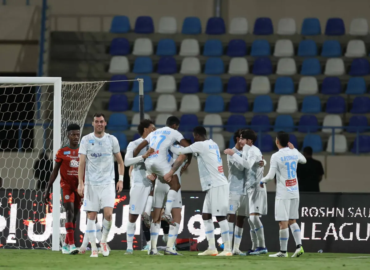 فرحة لاعبي الأخدود بعد هدف الفوز الثمين (تصوير: عدنان مهدلي)