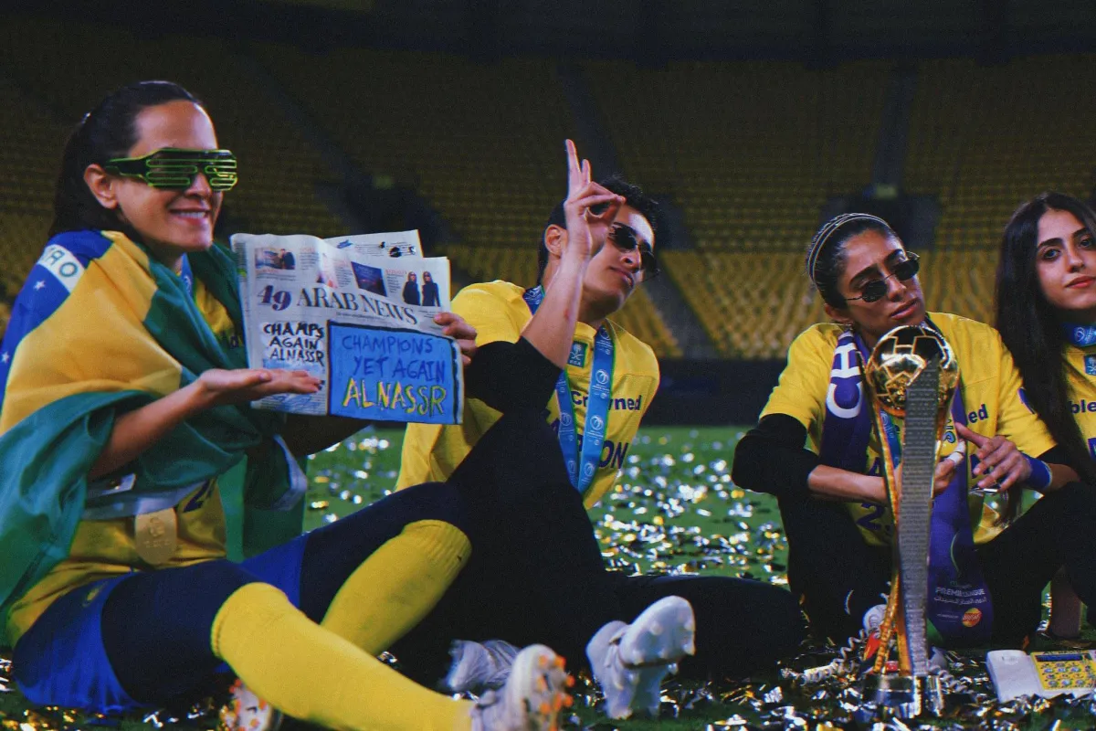 لاعبات النصر في أثناء احتفالهن بلقب الدوري السعودي (النصر)
