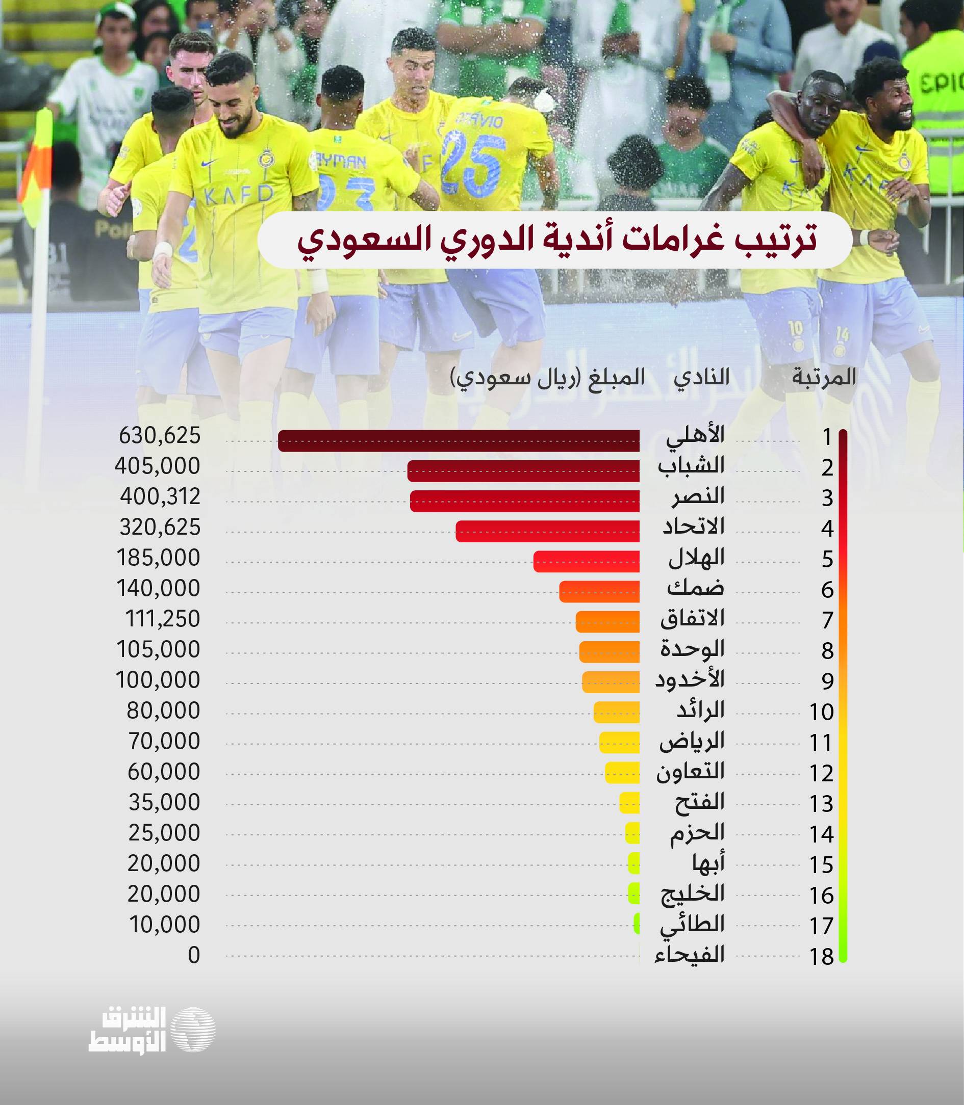 وحل نادي الشباب في المرتبة الثانية في القائمة بواقع 405 آلاف ريال، بينما جاء نادي النصر في المرتبة الثالثة بنحو 400 ألف ريال.