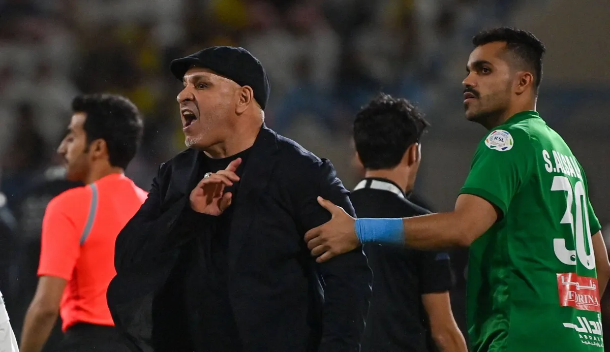 نور الدين بن زكري مدرب فريق الأخدود في لحظة اعتراض على حكم المباراة (تصوير: علي خمج)
