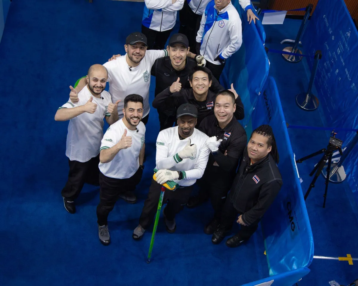 المنتخب السعودي للكرلنغ يحتفل بفوزه على تايلاند في «الآسياد» الشتوية (اللجنة الأولمبية السعودية)
