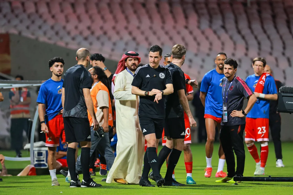 نقاش يجمع إداريي الوحدة وحكم المباراة قبل اتخاذ قرار التأجيل (تصوير: محمد المانع)
