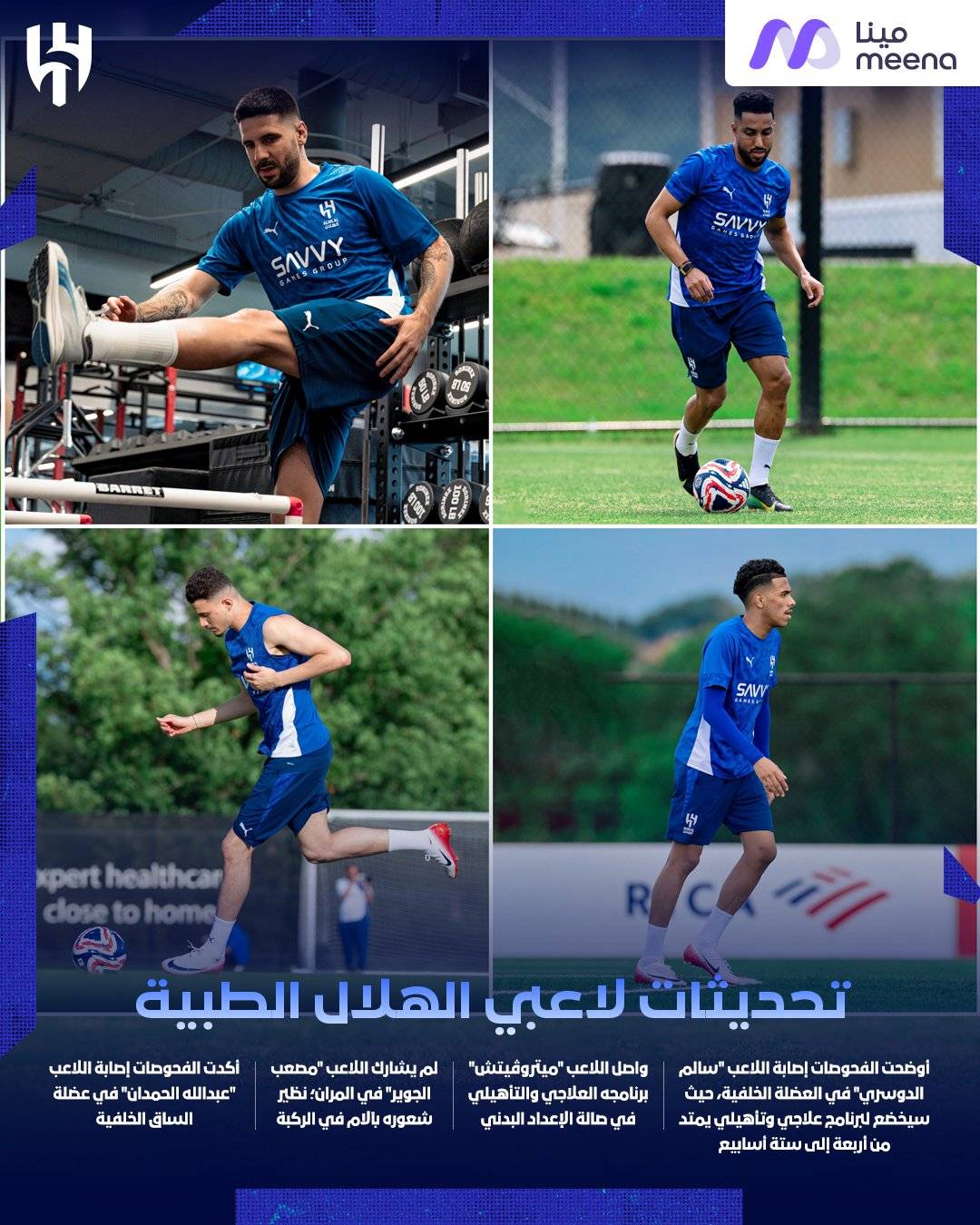 أعلن نادي الهلال تعرض سالم الدوسري قائد الفريق لإصابة في العضلة الخلفية، تعرض لها خلال مواجهة فريقه الماضية أمام باتشوكا المكسيكي، حيث سيخضع لبرنامج علاجي وتأهيلي يمتد من 4 إلى 6 أسابيع.