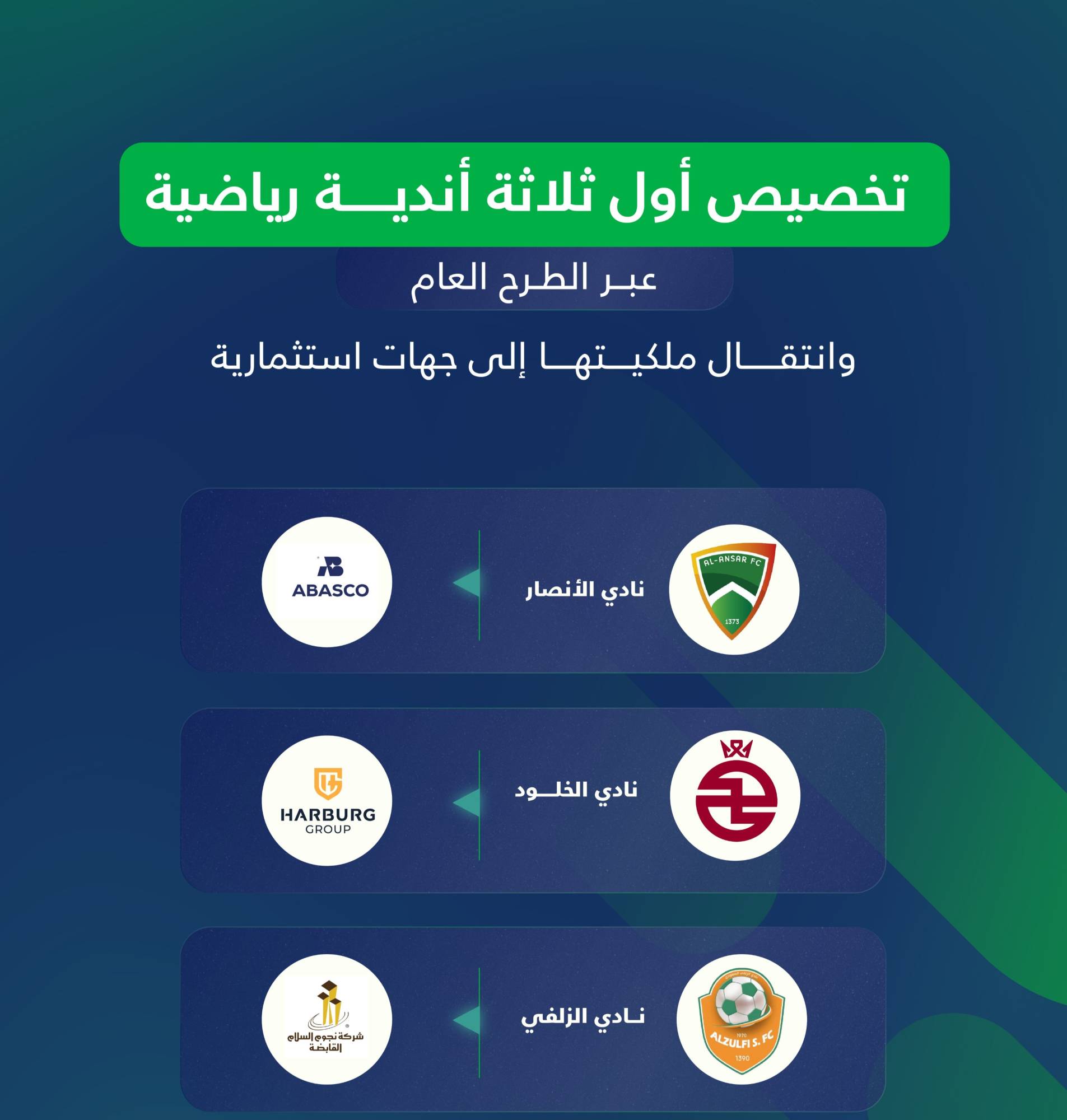 أعلنت وزارة الرياضة، اليوم الخميس، تخصيص أول ثلاثة أندية رياضية سعودية عبر الطرح العام، وهي الأنصار، والخلود، والزلفي، وانتقال ملكيتها إلى جهات استثمارية، وذلك بعد أن تم الإعلان في أغسطس (آب) الماضي عن طرح ستة أندية للتخصيص، وهي: الأنصار، والأخدود، والخلود، والزلفي، والعروبة، والنهضة. ضمن المسار الثاني لمشروع الاستثمار والتخصيص للأندية الرياضية. ويأتي الإعلان عن تخصيص الأندية الثلاثة بعد استكمالها الإجراءات النظامية، وقيام المركز الوطني للتخصيص بالإجراءات اللازمة لتأسيس شركات الأندية، لنقل ملكيتها للملاك الجدد، حيث ستنتقل ملكية نادي الزلفي إلى شركة «نجوم السلام»، فيما ستنتقل ملكية نادي الخلود إلى شركة «مجموعة هاربورغ»، وستنتقل ملكية نادي الأنصار إلى شركة «عودة البلادي وأبناؤه». كما أوضحت الوزارة أنه قد تم الانتهاء من فترة استقبال العروض المقدمة للاستحواذ على نادي النهضة، بعد أن طلبت الجهات الاستثمارية تمديد فترة التقديم، حيث يجري حالياً دراسة هذه العروض، فيما لم تستوفِ باقي الجهات الراغبة في الاستثمار بناديي الأخدود والعروبة الإجراءات والشروط اللازمة للاستحواذ عليهما، إذ تحرص الوزارة على ضمان نجاح عملية التخصيص، والتأكد من أن العروض المقدمة تخدم مصالح الأندية ومستقبلها الرياضي، وتسهم في تقديم نماذج متطورة، وتحقق الأهداف الاستراتيجية للمشروع.