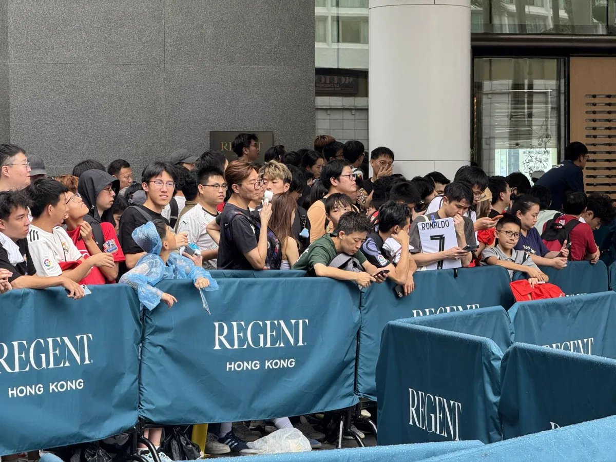 يتسمر مشجعون من هونغ كونغ لساعات طويلة أمام فندق «ريقنت» واقفين في طوابير وسط تنظيم من رجال الأمن الصناعي الخاص بالمنشأة، وذلك لرؤية النجم العالمي كريستيانو رونالدو، قائد فريق النصر، وهو مع فريقه من وإلى التدريبات.