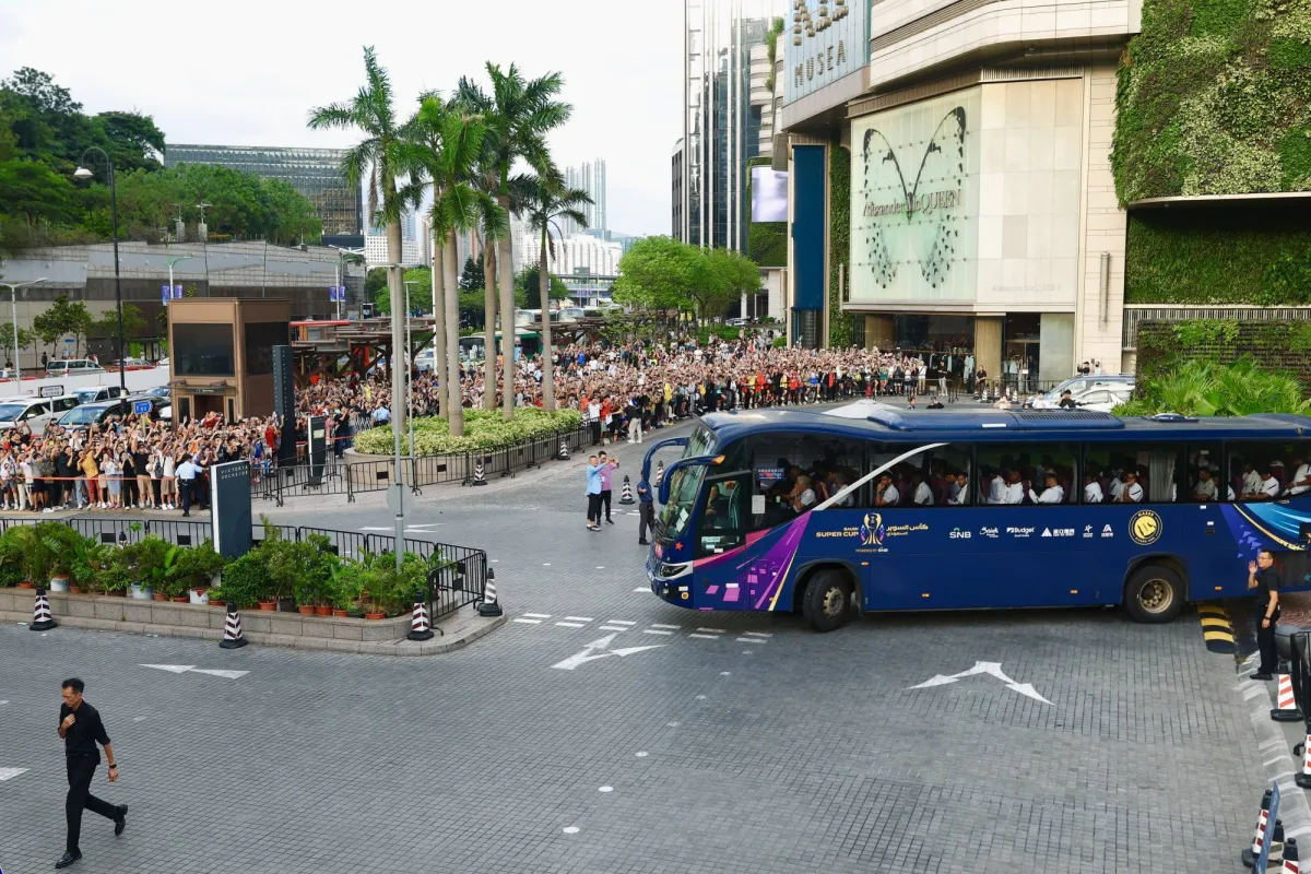 فندق ريغنت حيث يقيم النصر، لم يعرف الهدوء حتى في ساعات الصباح الأولى، وجرى وضع سياج أمني حول مدخل اللاعبين وحيث يسمح للجماهير بالاصطفاف ورؤية اللاعبين وحتى التصوير معهم أو الحصول على تواقيعهم.