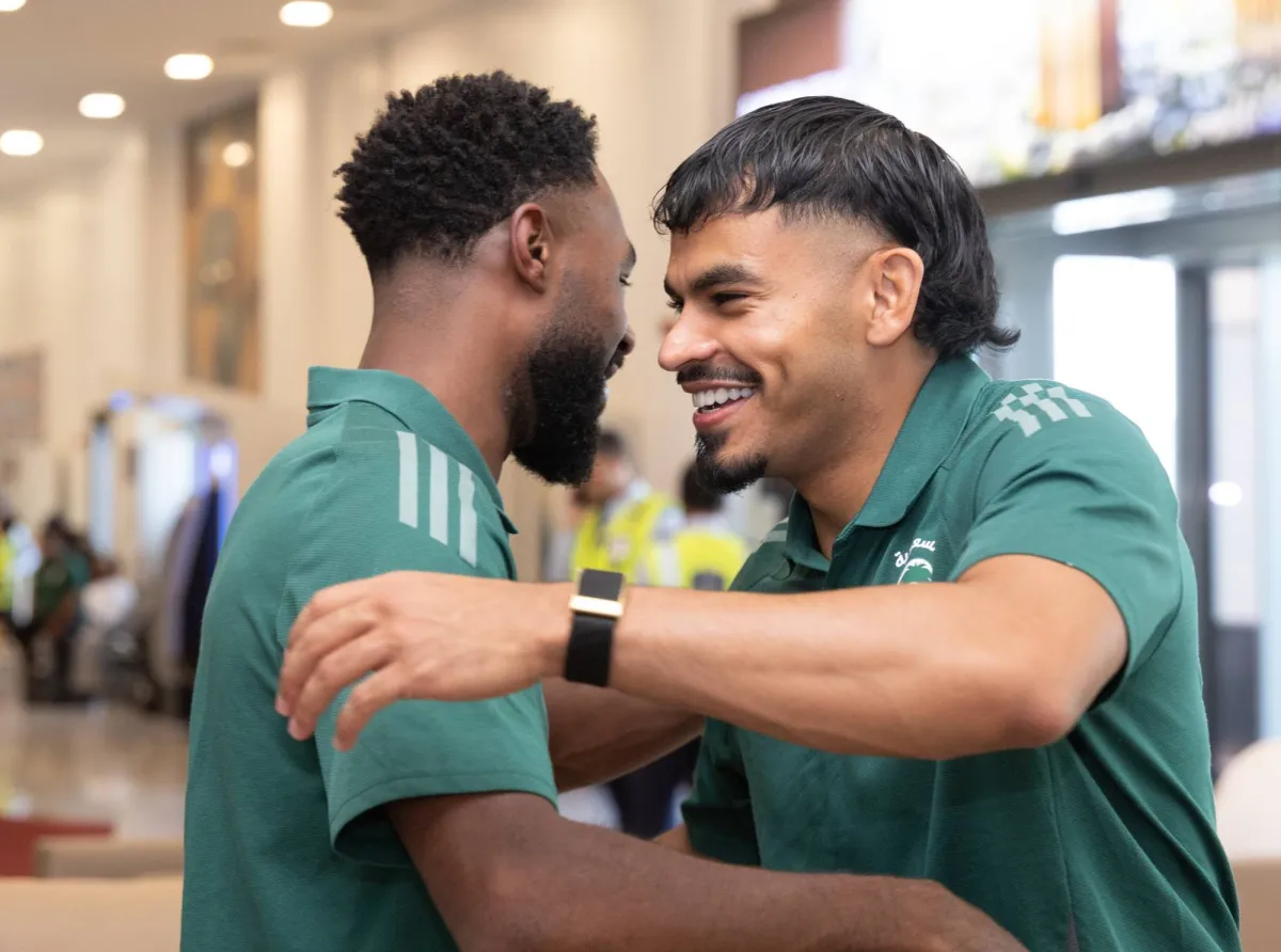 الناصر يعانق زميله مهند الشنقيطي قبل مغادرة بعثة المنتخب السعودي إلى التشيك (المنتخب السعودي)
