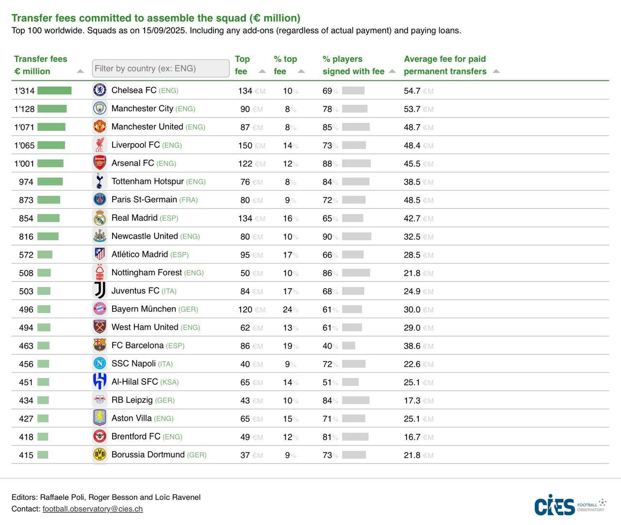 وكانت الصدارة من نصيب تشيلسي، الذي بلغت قيمة تشكيلته الحالية 1.314 مليار يورو، وهي الأعلى في العالم. وتضمن هذا الرقم صفقة مويسيس كايسيدو البالغة 134 مليون يورو، أي ما يعادل عشرة بالمائة من إجمالي استثمارات النادي. كما أن 69 في المائة من لاعبي الفريق الحاليين جرى التعاقد معهم مقابل رسوم انتقال، بمتوسط بلغ 54.7 مليون يورو للصفقة الواحدة.