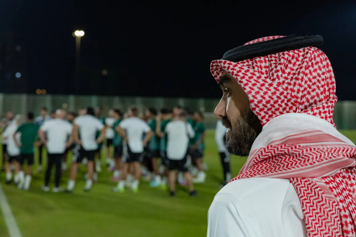 الأمير عبد العزيز الفيصل خلال متابعته مران «الأخضر» (المنتخب السعودي)