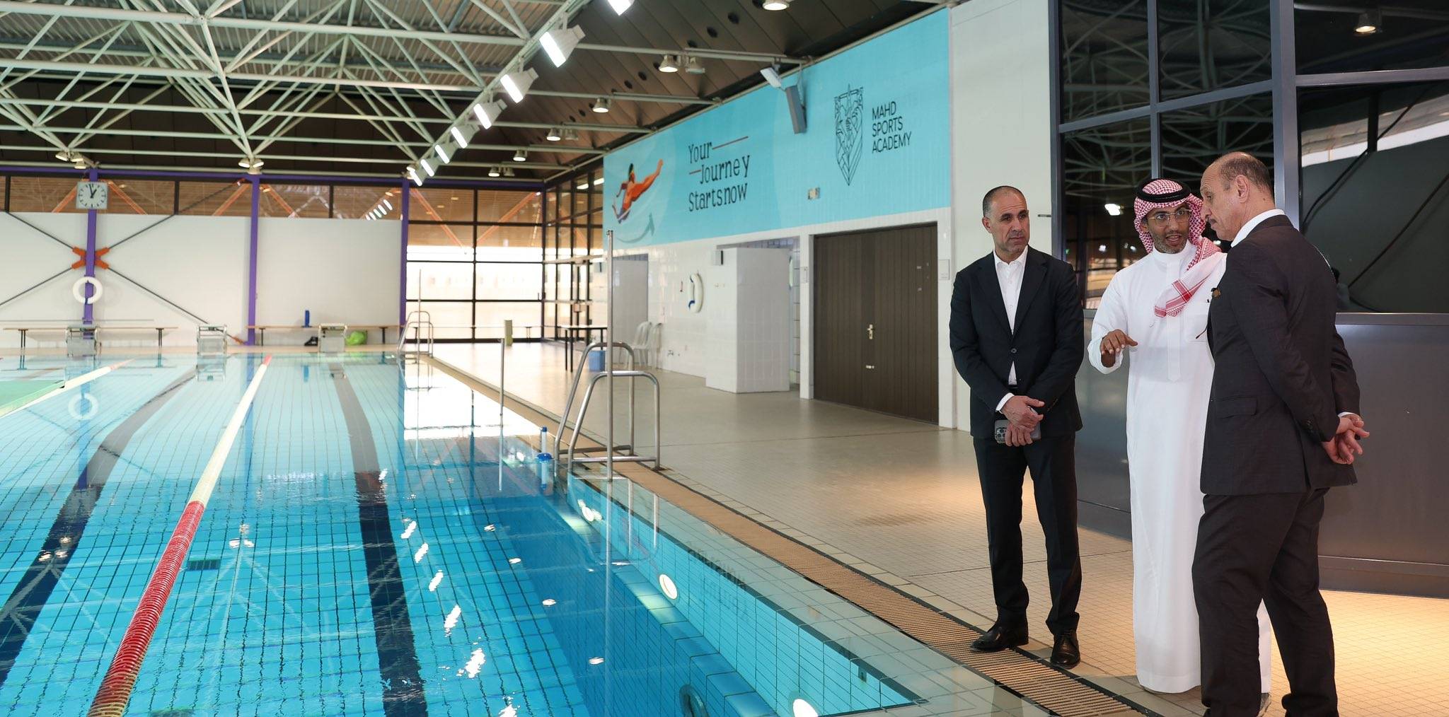 جانب من الجولة لمرافق السباحة الحديثة في الأكاديمية، التي تُعد من أبرز منشآتها المخصصة لإعداد الرياضيين في مختلف الألعاب (أكاديمية مهد)