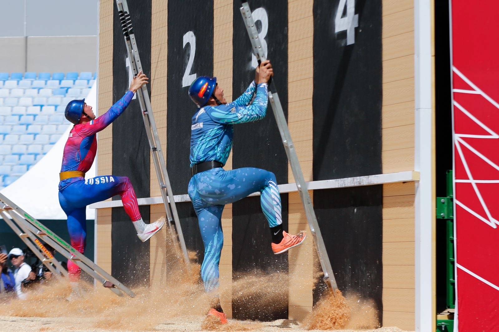 وشهدت منافسات اليوم الأول للبطولة خلال الفترة الصباحية إقامة الأدوار التمهيدية لسباق التسلق باستخدام سلم الخطاف إلى الطابق الرابع من برج التدريب للرجال، وأقيمت الأدوار التمهيدية في سباق تسلق البرج بالسلالم والصعود إلى الطابق الثاني من برج التدريب للسيدات، تلتها منافسات نصف النهائي، لسباق التسلق باستخدام سلم الخطاف إلى الطابق الرابع من برج التدريب للرجال.