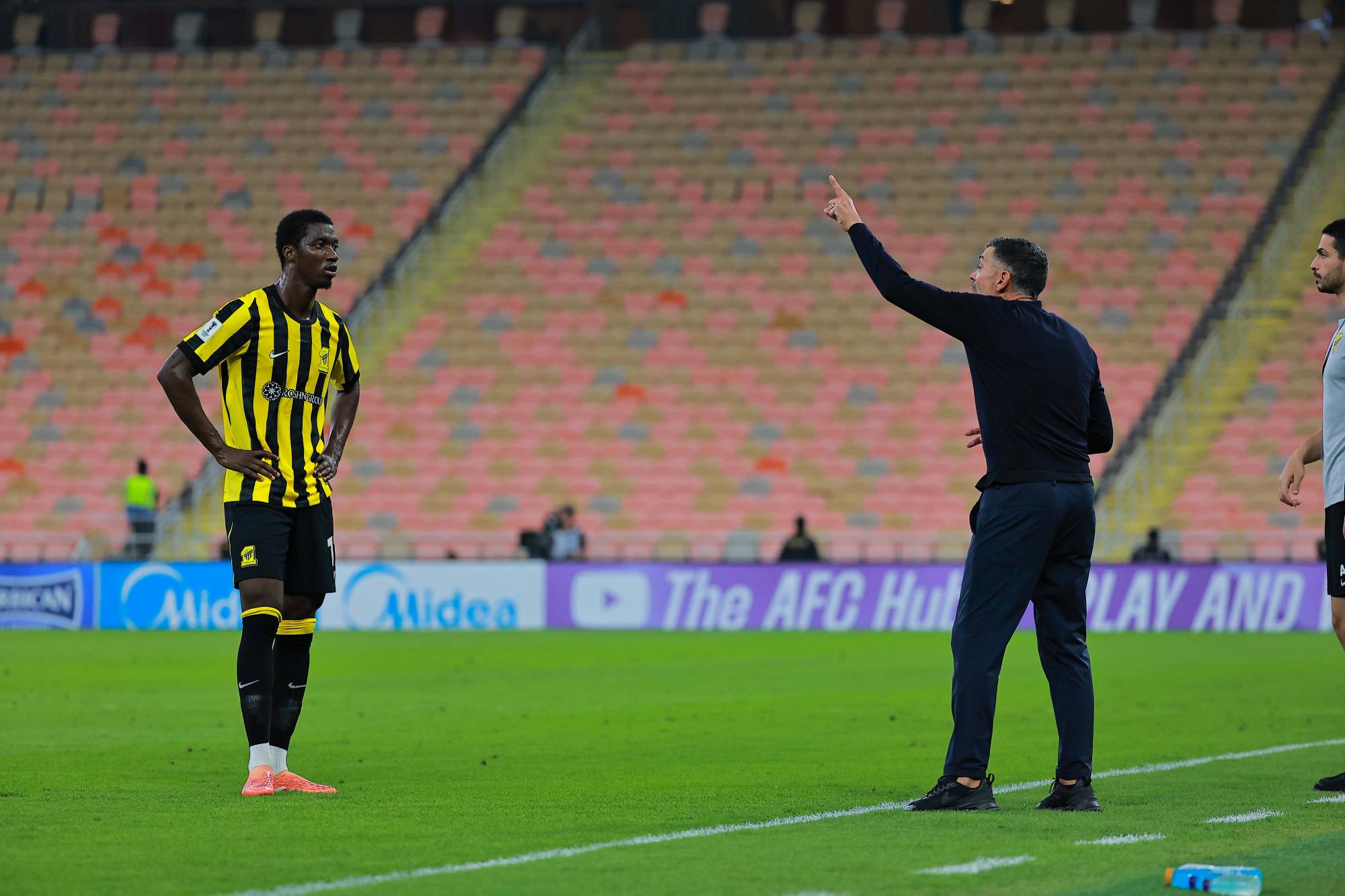 في الوقت الذي تشاهد الجماهير المواجهة داخل الملعب، كان هناك ما يلفت أنظار الحاضرين في الملعب، خاصة أولئك الجالسين بالقرب من كونسيساو مدرب الاتحاد في المقاعد الخلفية لمقاعد البدلاء والمنطقة الفنية، حيث لم يتوقف كونسيساو عن إعطاء التوجيهات للاعبيه في أرضية الملعب.