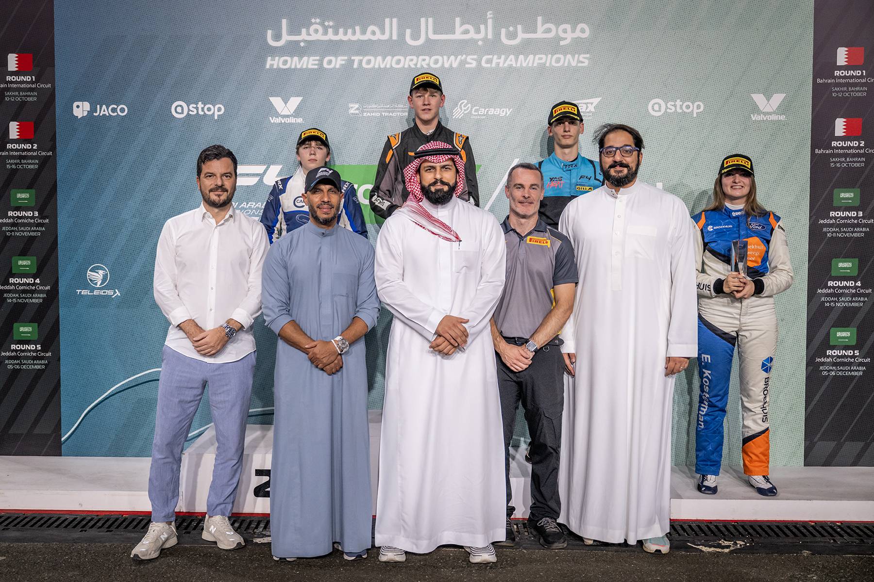 توج مساء السبت المهندس منصور المقبل، الرئيس التنفيذي المكلف للاتحاد السعودي للسيارات والدراجات النارية، والرئيس التنفيذي لشركة رياضة المحركات السعودية، البريطاني لويس ويريل، سائق فريق كاراجي، بجائزة المركز الأول في منافسات السباق الثاني والأخير للجولة الرابعة من بطولة أرامكو السعودية للفورمولا 4، والتي استضافتها حلبة كورنيش جدة.