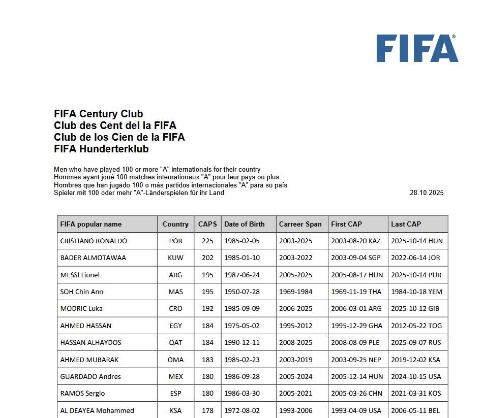 ووفقاً لآخر تحديث للنادي المئوي في الاتحاد الدولي لكرة القدم «الفيفا» لشهر أكتوبر، فإن الصدارة من نصيب النجم البرتغالي كريستيانو رونالدو قائد منتخب البرتغال الذي خاض خلال مسيرته مع منتخب بلاده 225 مباراة، يأتي خلفه في المركز الثاني الكويتي بدر المطوع الذي لعب 202 مباراة، ثم ثالثاً النجم الأرجنتيني ليونيل ميسي الذي شارك في 195 مباراة وهو ذات الرقم الذي يحمله الماليزي تشين آن سو، أما في المركز الخامس فيحضر الكرواتي لوكا مودريتش بعدد 192 مباراة.