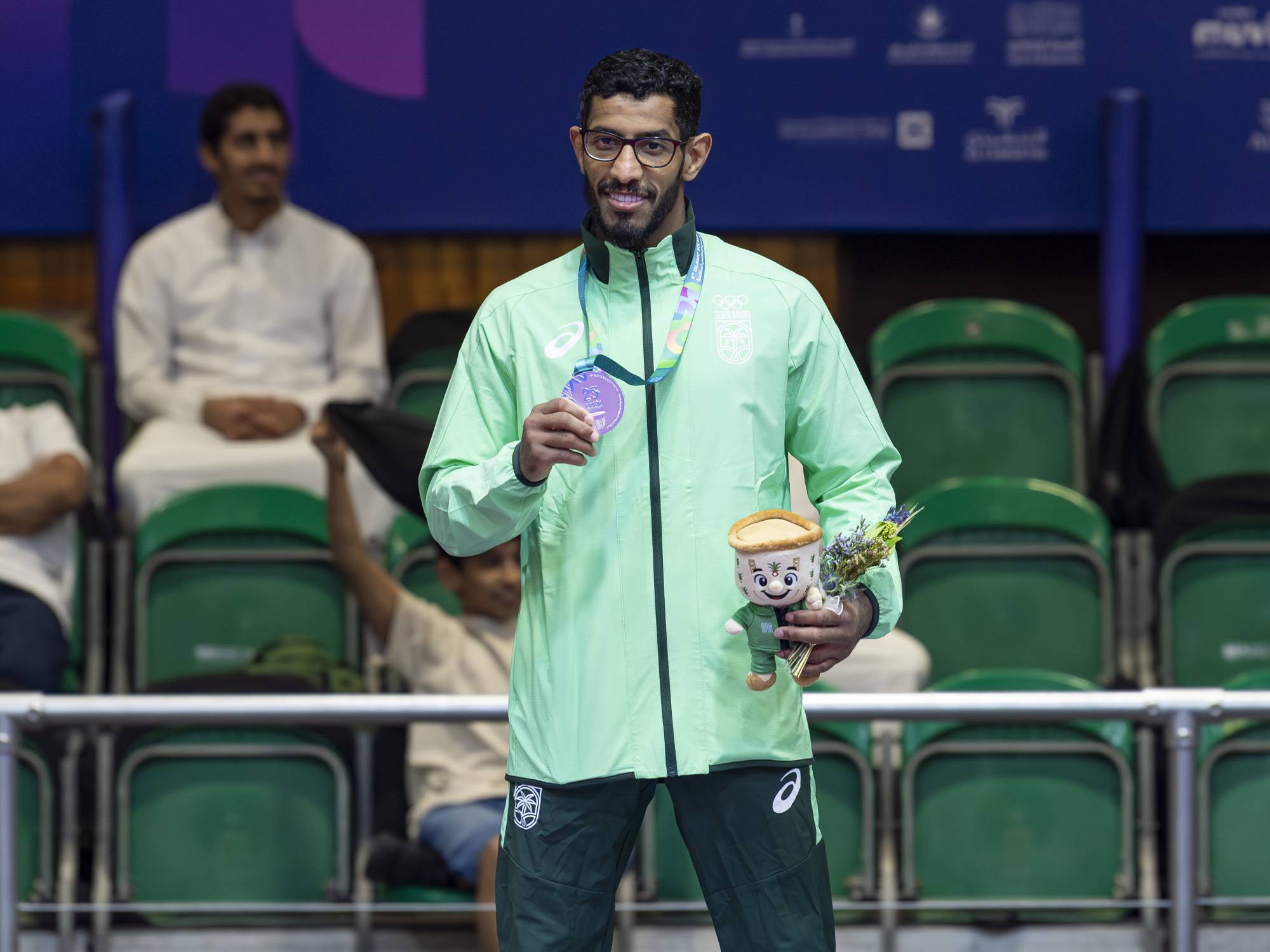 ونال زميله أسامة صالح الميدالية البرونزية، لوزن تحت 77 كيلوغراماً، بعد فوزه على الأردني أسامة نباص بنتيجة 8 - 2.