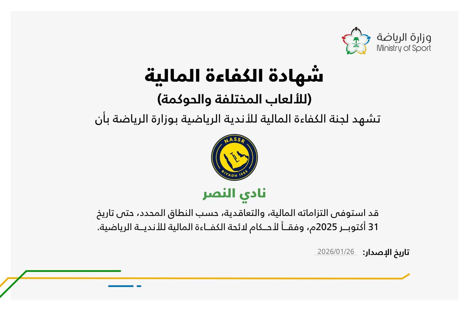وبحسب الوثيقة الصادرة عن لجنة الكفاءة المالية للأندية الرياضية بوزارة الرياضة، فإن النصر استوفى التزاماته المالية والتعاقدية ضمن النطاق المحدد حتى تاريخ 31 أكتوبر (تشرين الأول) 2025، وذلك وفق أحكام لائحة الكفاءة المالية للأندية الرياضية، فيما جاء تاريخ الإصدار 26 يناير (كانون الثاني) 2026.
