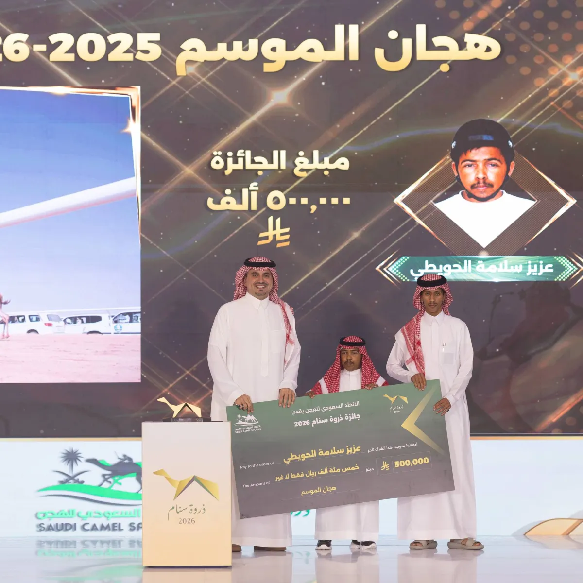 كرم الأمير فهد بن جلوي بن عبدالعزيز، نائب رئيس اللجنة الأولمبية والبارالمبية السعودية ورئيس الاتحاد السعودي للهجن، الفائزين في حفل «ذروة سنام 2026» الذي أقامه الاتحاد السبت في ميدان الجنادرية للهجن بالرياض بمجموع جوائز مالية تتجاوز مليوناً ونصف المليون وبحضور عدد من الشخصيات الرياضية وملاك الهجن والمضمرين وعدد من منسوبي وسائل الإعلام.
