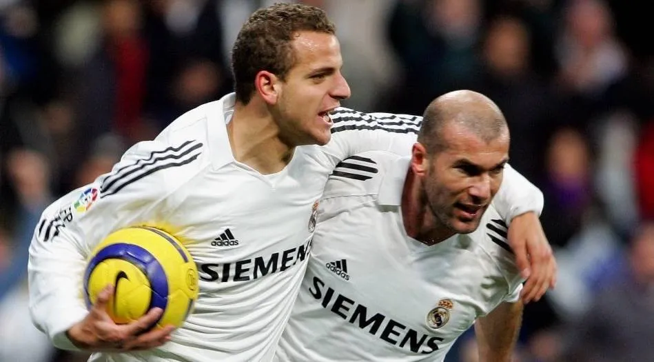 سولدادو محتفلاً مع زيدان بعد أحد أهدافه بقميص الريال (الشرق الأوسط)