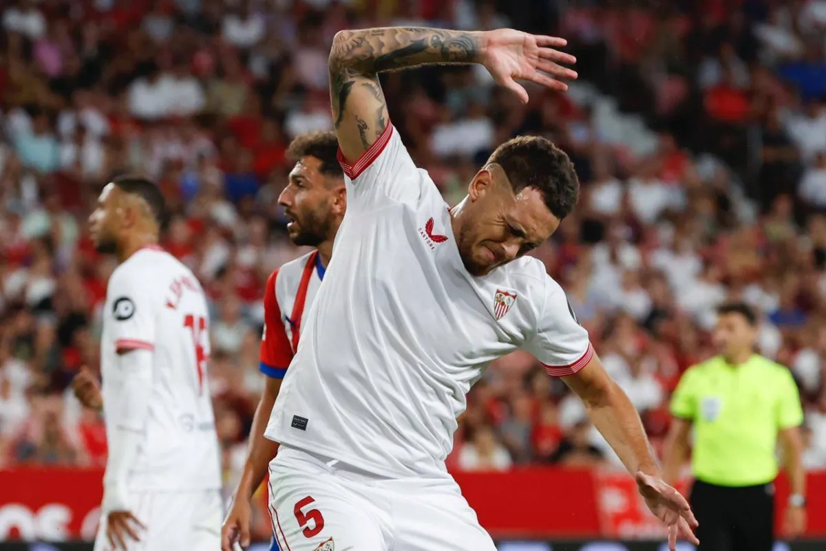 لوكاس أوكامبوس لاعب اشبيليه يتحسر على إحدى الفرص المهدرة أمام مرمى جيرونا (إ.ب.أ)