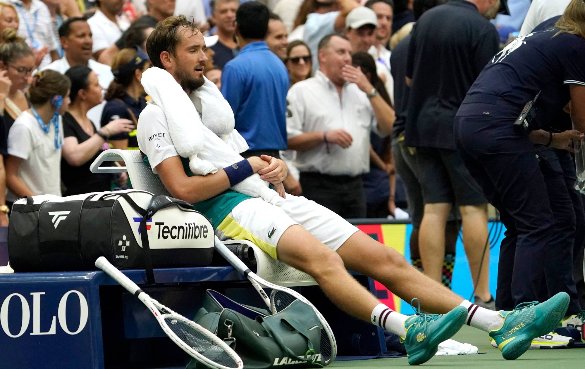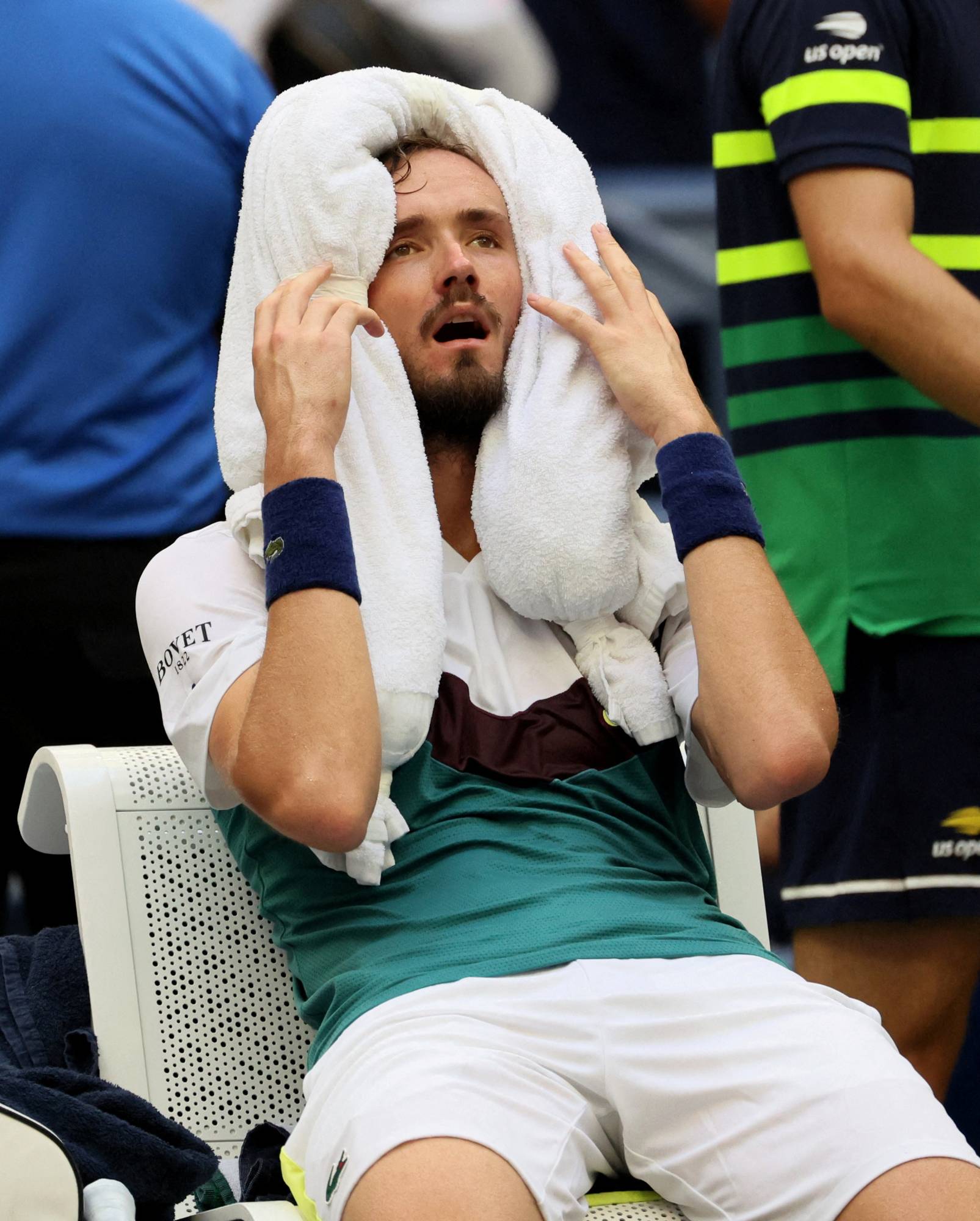 وأشار مدفيديف إلى أنه بدا منزعجاً ومصدوماً عندما احتاج إلى الرعاية الطبية على هامش مباراته أمام روبليف، وقال: «كانت برفقتي منشفة الثلج. كل شيء كان ضبابياً، وكأنني لا أرى بشكل جيد. لم يعد هناك المزيد من الأدرينالين... ذهبت إلى غرف تغيير الملابس بصعوبة وكنت أشعر بحاجة إلى الجلوس هناك لبضع ساعات».