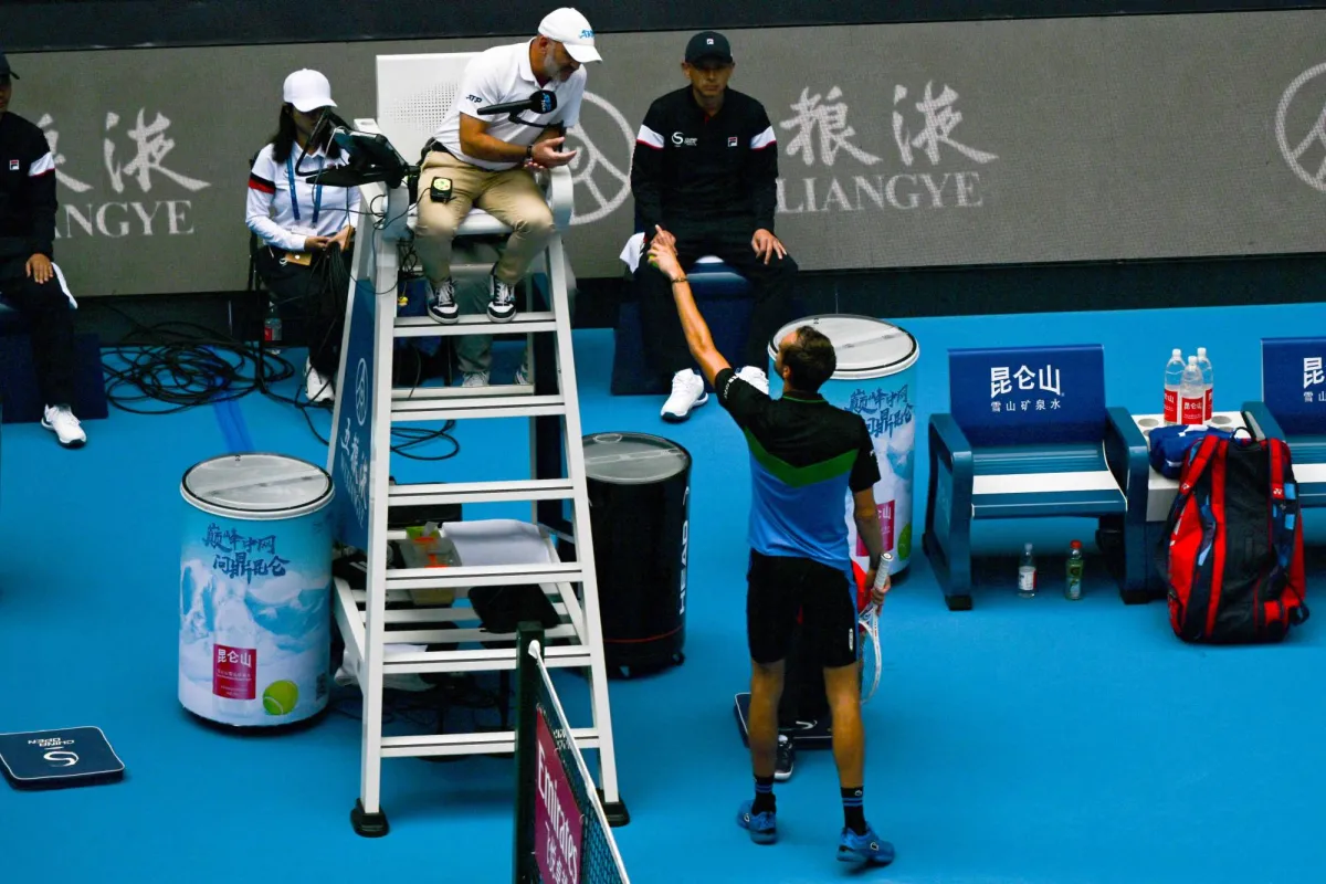 مدفيديف يتحدث مع حكم المباراة التي حسمها لصالحه (أ.ف.ب)
