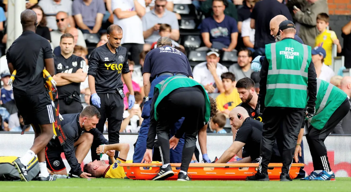 كريس باشام قائد شيفيلد يتلقى الرعاية الطبية الأولية خلال مواجهة فولهام قبل نقله للمستشفى (رويترز)