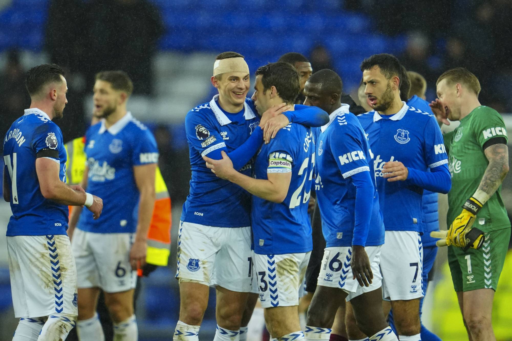 لاعبو إيفرتون خلال مباراة أستون فيلا (أ.ب)