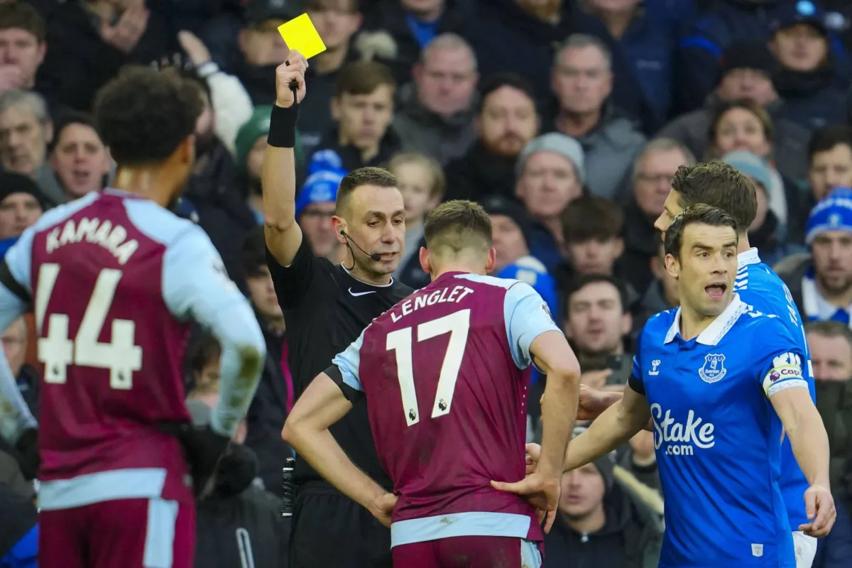 الحكم ديفيد كوت يشهر بطاقة صفراء لكليمنت لينغليت لاعب أستون فيلا (أ.ب)