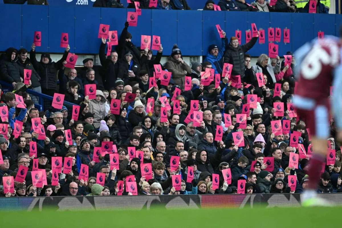 في المواجهة ضد مانشستر يونايتد قبل شهر انتظرت جماهير إيفرتون حتى الدقيقة العاشرة (إشارة للنقاط العشر) لترفع بطاقات وردية لامعة تحمل شعار «الأسد» الخاص بالدوري الإنجليزي الممتاز وكلمة «فاسد»، اعتراضا على الرابطة المسؤولة عن المسابقة، ووسط صيحات استهجان بدأت مثل أنين ثم ارتفعت ببطء عبر أنحاء الملعب كزئير أسد جريح.