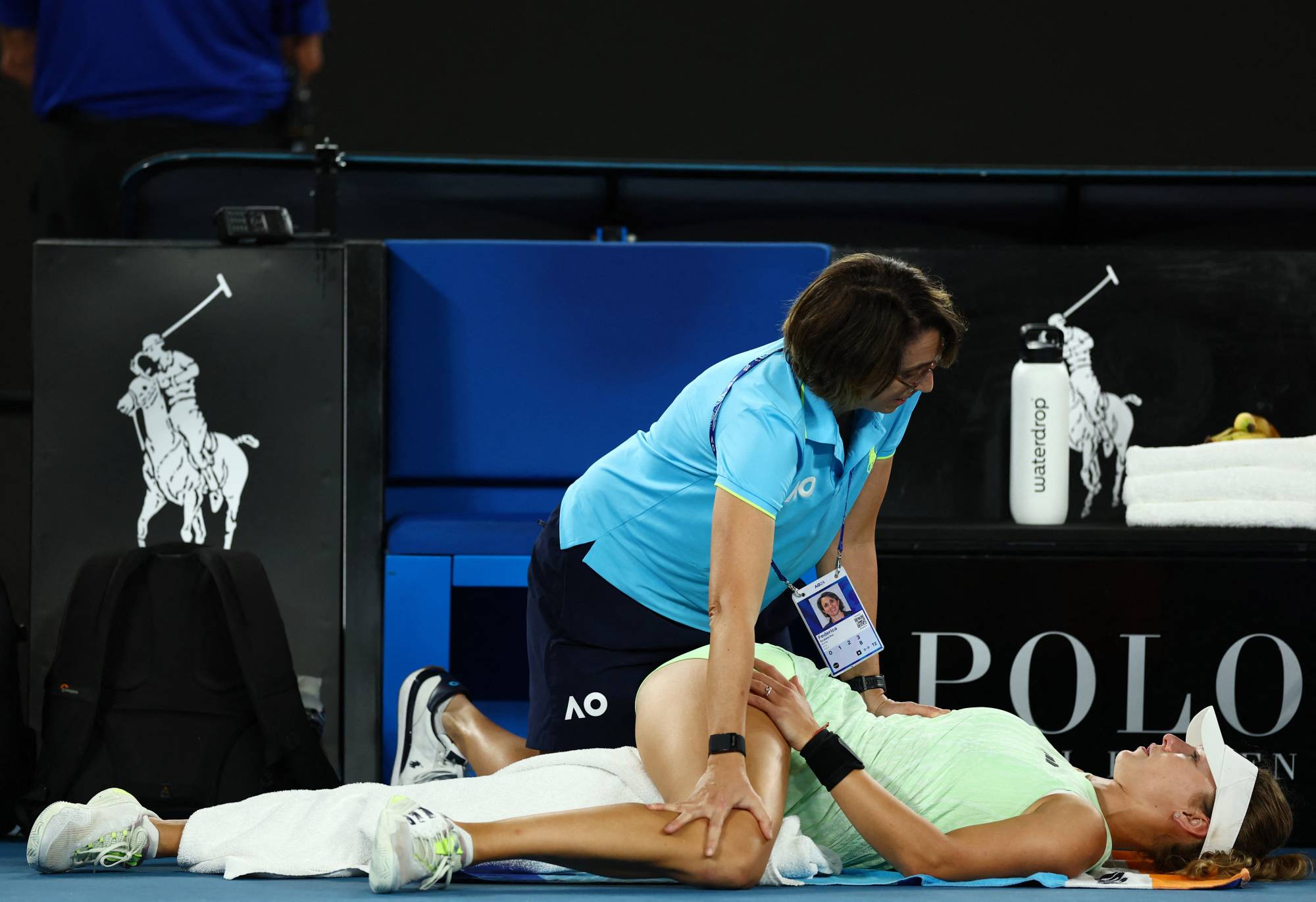 كالينسكايا أثناء تلقي العلاج بسبب مشكلة في ساقها اليمنى (رويترز)
