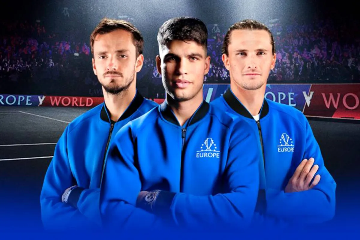 الإسباني ألكاراس (وسط) سيشارك لأول مرة بجانب الألماني زفيريف (يمين) والروسي ميدفيديف (يسار) في فريق أوروبا (الشرق الأوسط)