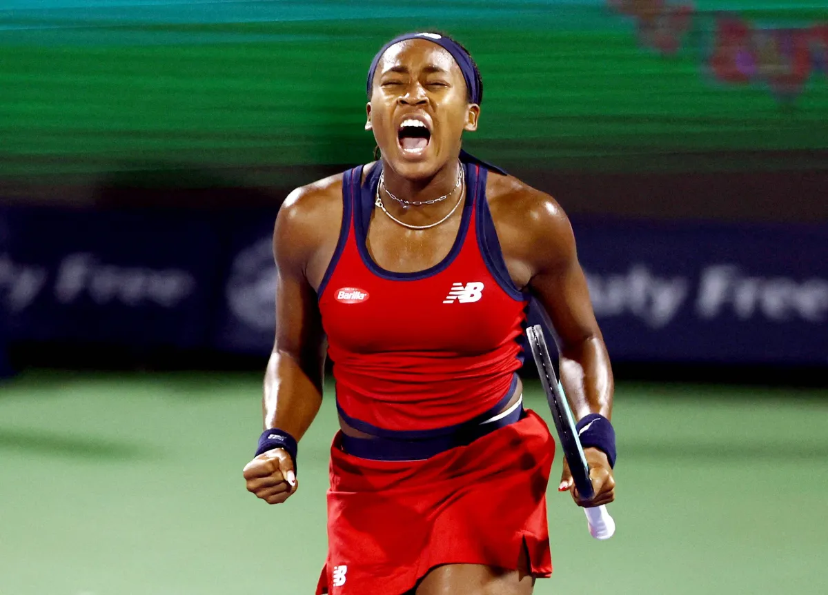فرحة الأميركية كوكو غوف عقب فوزها على التشيكية كارولينا بليشكوفا ضمن منافسات دورة دبي للتنس (رويترز)