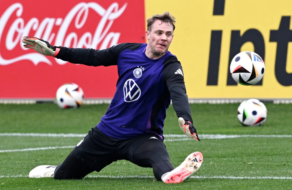 مانويل نوير خلال مشاركته تدريبات منتخب بلاده (ألمانيا) التي أصيب على إثرها (د.ب.أ)