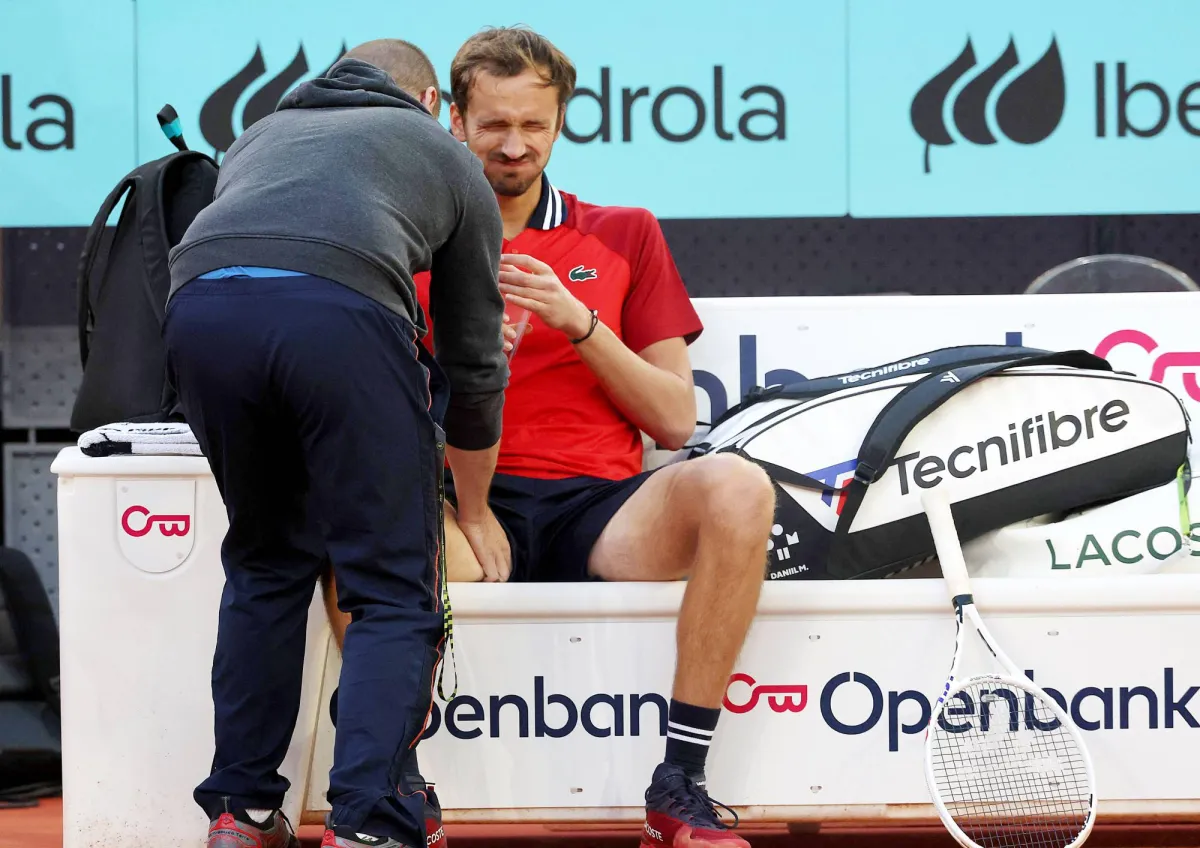ووفقاً لوكالة رويترز, طلب ميدفيديف المصنف الرابع في البطولة وقتاً مستقطعاً طبياً أثناء تقدمه 3-2 في المجموعة الأولى، وتواصلت معاناته الواضحة في الحركة بعد العودة إلى الملعب.
