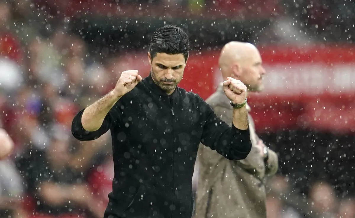 أرتيتا مدرب الأرسنال محتفلاً بفوز فريقه أمام مانشستر يونايتد ضمن منافسات الدوري الإنجليزي (أ.ب)