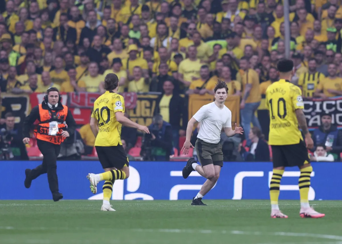 وتوقفت مباراة ريال مدريد الإسباني ضد بوروسيا دورتموند الألماني بعدما اقتحم 3 أشخاص أرض الملعب، واقتربوا من بعض اللاعبين.