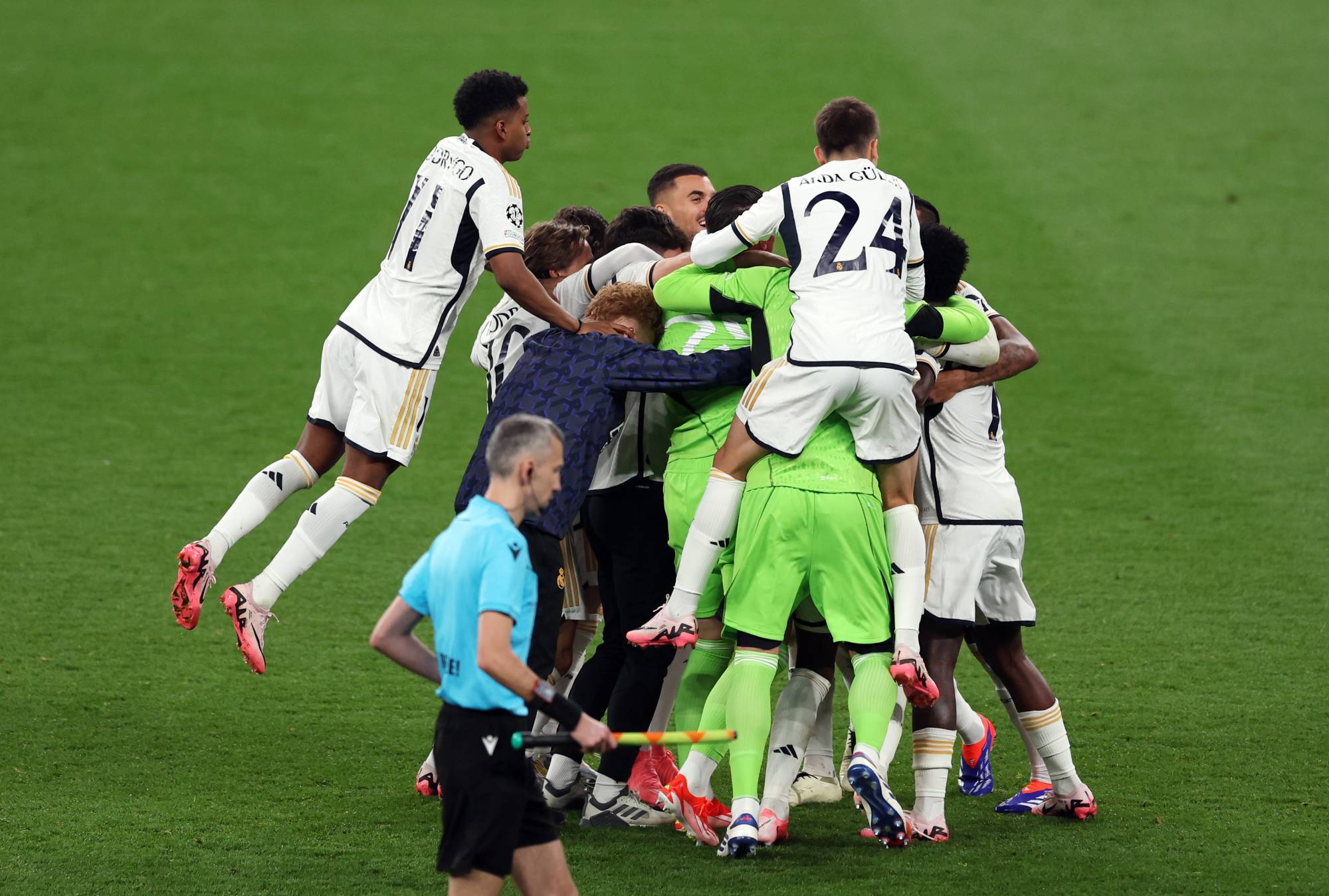 ولجأ ترزيتش إلى المخضرم ماركو رويس في مباراته الأخيرة مع دورتموند قبل رحيله بنهاية عقده الشهر الحالي، حيث أشركه بدلا من آديمي.ودفع دورتموند ثمن إهدار الفرص عندما أرسل كروس ركلة ركنية حولها كاربخال بضربة رأس في الزاوية البعيدة لمرمى كوبل.وأبقى هوملز على آمال دورتموند عندما أبعد محاولة من جود بلينغهام من مدى قريب، وبعد ذلك بقليل أبعد كوبل ركلة حرة من كروس.وحسم فينيسيوس جونيور تتويج مدربه كارلو أنشيلوتي بلقبه الخامس في البطولة من مدى قريب قبل سبع دقائق من النهاية.ومنح أنشيلوتي لاعبه كروس فرصة الحصول على تحية جماهير فريقه في مباراته الأخيرة مع ريال مدريد بعد قراره الاعتزال بنهاية بطولة أوروبا في يوليو تموز المقبل، وبعد التتويج بلقب البطولة للمرة السادسة في تاريخه.