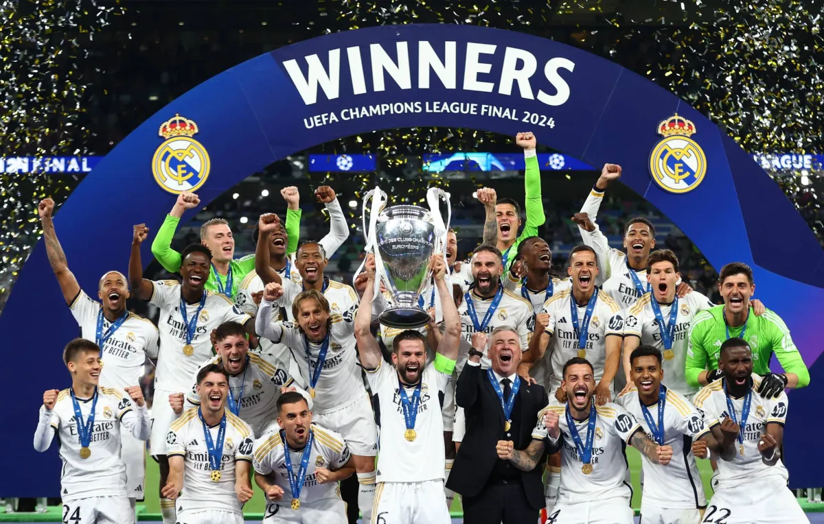 أحرز داني كارفخال وفينيسيوس جونيور هدفين قرب النهائي ليتوج ريال مدريد بطلا لدوري أبطال أوروبا لكرة القدم بعد فوزه 2-صفر على بروسيا دورتموند الألماني باستاد ويمبلي السبت.وافتتح كارفخال التسجيل لبطل إسبانيا في الدقيقة 74، وحسم فينيسيوس جونيور اللقب قبل سبع دقائق من النهاية، ليعزز ريال مدريد رقمه القياسي بحصد اللقب للمرة 15 في تاريخه.