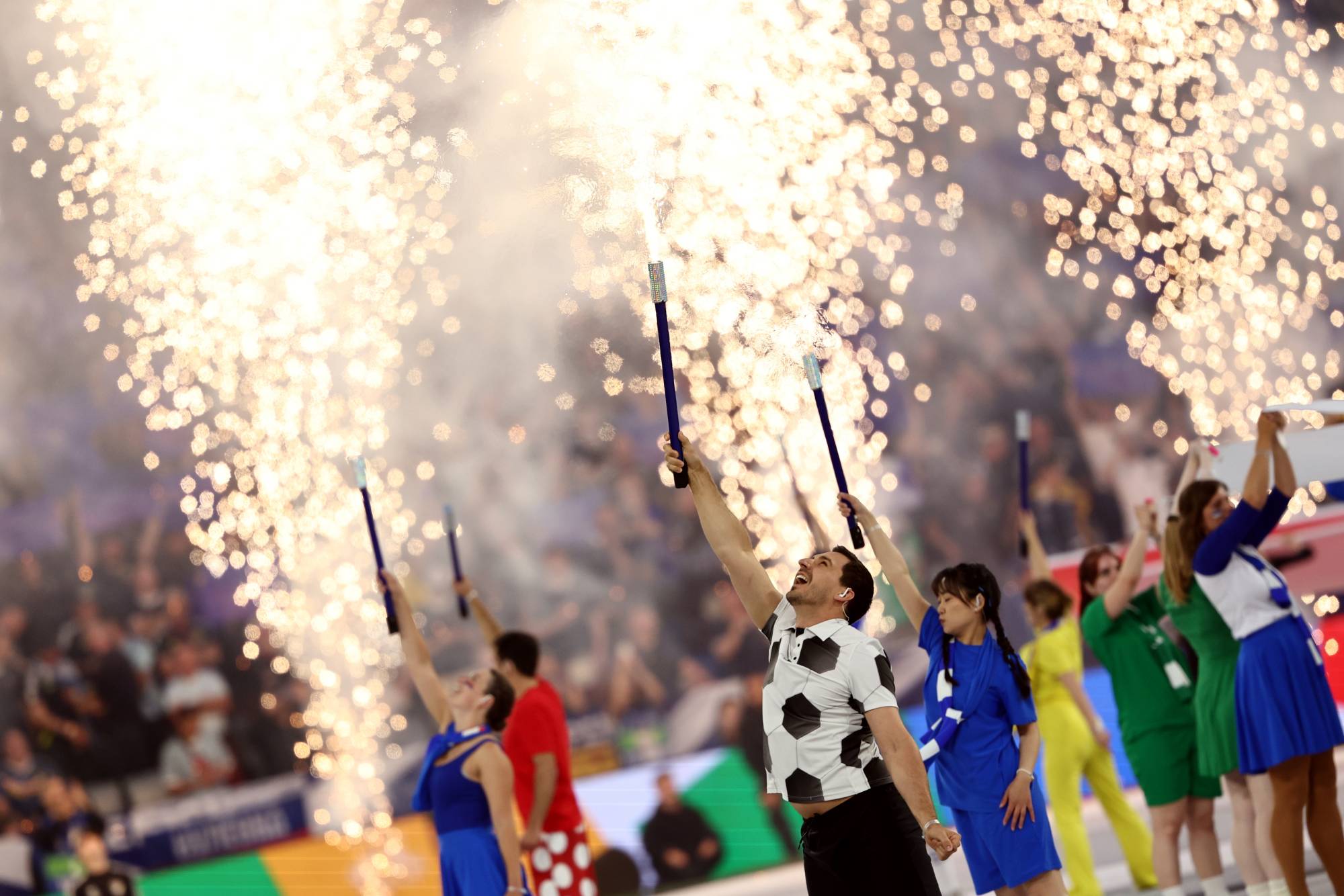 وأدى الراقصون الذين ارتدوا ألوان الـ24 منتخباً المشاركين في البطولة الأغنية الرسمية «نار» التي قام بغنائها المطرب ليوني أمام ملعب ممتلئ بـ66 ألف متفرج، كان في مقدمتهم الرئيس الألماني فرنك - فالتر شتاينماير.