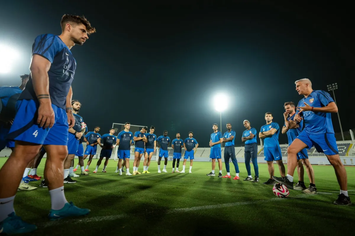 لاعبو العين يستمعون لمدربهم قبل المباراة الافتتاحية (نادي العين)